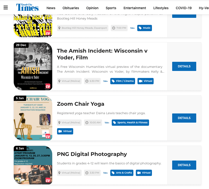 Events calendar check out all the events happening at the adams community! The documentary the hunt for planet b is showing sunday, feb. This annual event runs from 4 p.m. 23, at the figge art museum, 225 w. Entertainment and events around quad cities, moline, illinois.